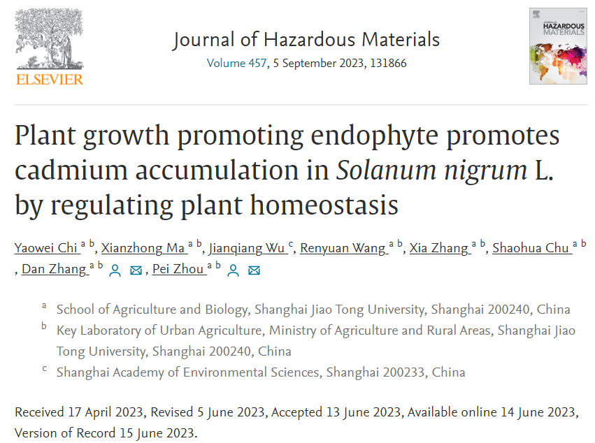 近日,上海交通大学农业与生物学院周培教授团队在生态环境领域期刊Journal of Hazardous Materials (中科院一区Top)在线发表了题为Plant growth promoting endophyte promotes cadmium accumulation in Solanum nigrum L. by regulating plant homeostasis的研究论文。