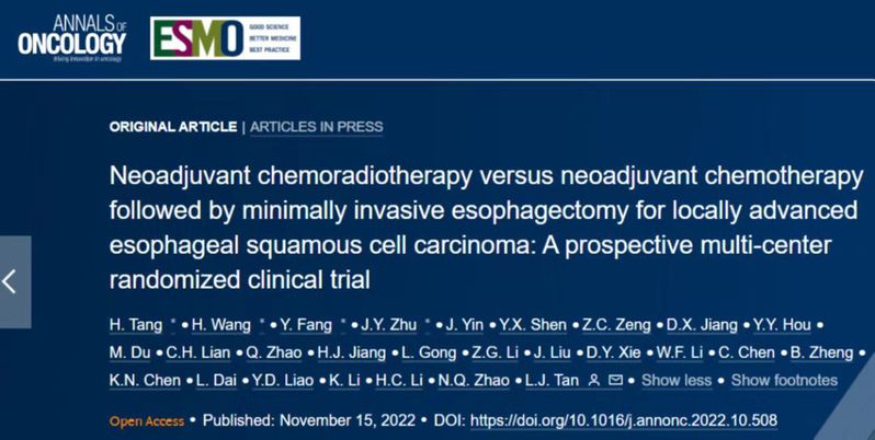 近期,复旦大学附属中山医院谭黎杰团队在Annals of Oncology在线发表题为“Neoadjuvant chemoradiotherapy versus neoadjuvant chemotherapy followed by minimally invasive esophagectomy for locally advanced esophageal squamous cell car