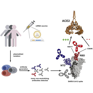 在这项研究中,作者分析了疫苗诱导的多克隆抗体以及来自接受SARS-CoV-2刺突mRNA疫苗的个体的浆母细胞衍生的mAb。疫苗接种者中的多克隆抗体应答是稳健的,与自然感染后观察到的相当或超过。然而,接种疫苗后与中和抗体结合的比例大于自然感染后的比例,并且在单克隆水平上,作者发现大多数疫苗诱导的抗体不具有中和活性。作者还发现针对SARS-CoV-2刺突的NTD和RBD以及针对季节性人冠状病毒OC43和HKU1刺突的原始抗原性sin样骨架的mAb的共同优势。取消了针对携带E484K的临床病毒分离物的NTD-mAb而非RBD-mAb的中和活性以及NTD的广泛变化,表明一定比例的疫苗诱导的RBD结合抗体可以提供针对携带病毒变体的实质性保护。单个E484K RBD突变。