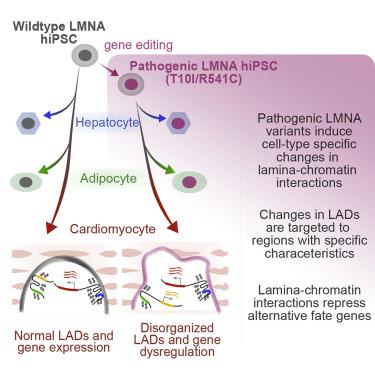 核纤层蛋白A/C(LMNA)中的致病性突变会导致异常的核结构和椎间盘突出症。这些疾病具有无数的组织特异性表型,包括扩张型心肌病(DCM),但是LMNA突变如何导致组织受限的疾病表型仍不清楚。作者将来自DCM个体的LMNA突变引入人诱导的多能干细胞(hiPSC),发现与肝细胞或脂肪细胞相比,hiPSC衍生的心肌细胞表现出异常的核形态和外周染色质的特异性破坏。破坏的区域富含转录活性基因和具有较低LAMIN B1接触频率的区域。在突变型心肌细胞中破坏的层染色质相互作用富集了与非肌细胞谱系相关的基因,并与这些基因的更高表达相关。来自具有LMNA变体的个体的心肌类似地显示出非肌细胞途径的异常表达。作者建议椎板网络保护细胞身份,并且致病性LMNA变体破坏具有特定表观遗传和分子特征的外周染色质,从而导致通常在其他细胞类型中表达的基因表达错误。