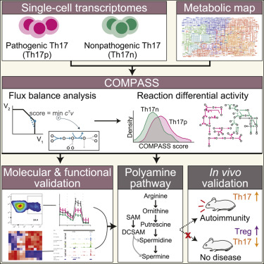 代谢是免疫细胞功能的主要调节因子,但研究个体细胞的代谢状态仍然很困难。在这里,我们提出Compass,一种基于单细胞RNA测序和通量平衡分析来表征细胞代谢状态的算法。我们应用Compass将代谢状态与T辅助细胞17(Th17)功能变异性(致病潜能)相关联,并恢复了糖酵解和脂肪酸氧化之间的代谢转换,类似于已知的Th17/调节性T细胞(Treg)差异,我们通过代谢验证化验。Compass还预测Th17致病性与精氨酸和下游多胺代谢有关。实际上,多胺相关酶表达在致病性Th17中增强并且在Treg细胞中被抑制。多胺代谢的化学和遗传扰动抑制Th17细胞因子,促进Foxp3表达,并将Th17细胞的转录组和表观基因组重塑为Treg样状态。多胺途径的体内扰动改变了脑炎性T细胞的表型并减弱了CNS自身免疫中的组织炎症。