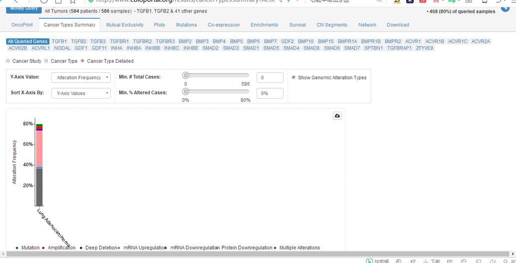 第二个页面是肺腺癌各数据类型的分布,包括突变、扩增、高度缺失、mRNA高表达、mRNA低表达、蛋白低表达、复杂改变。cBioPortal for Cancer Genomics提供大规模癌症基因组数据集的可视化和分析。